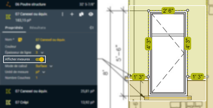 Les modèles de marqueur (au panneau de droite) et les relevés (au panneau de gauche) de type longueur ou surface auront l’option d’afficher ou non les mesures sur chacun des segments colorés sur votre plan.